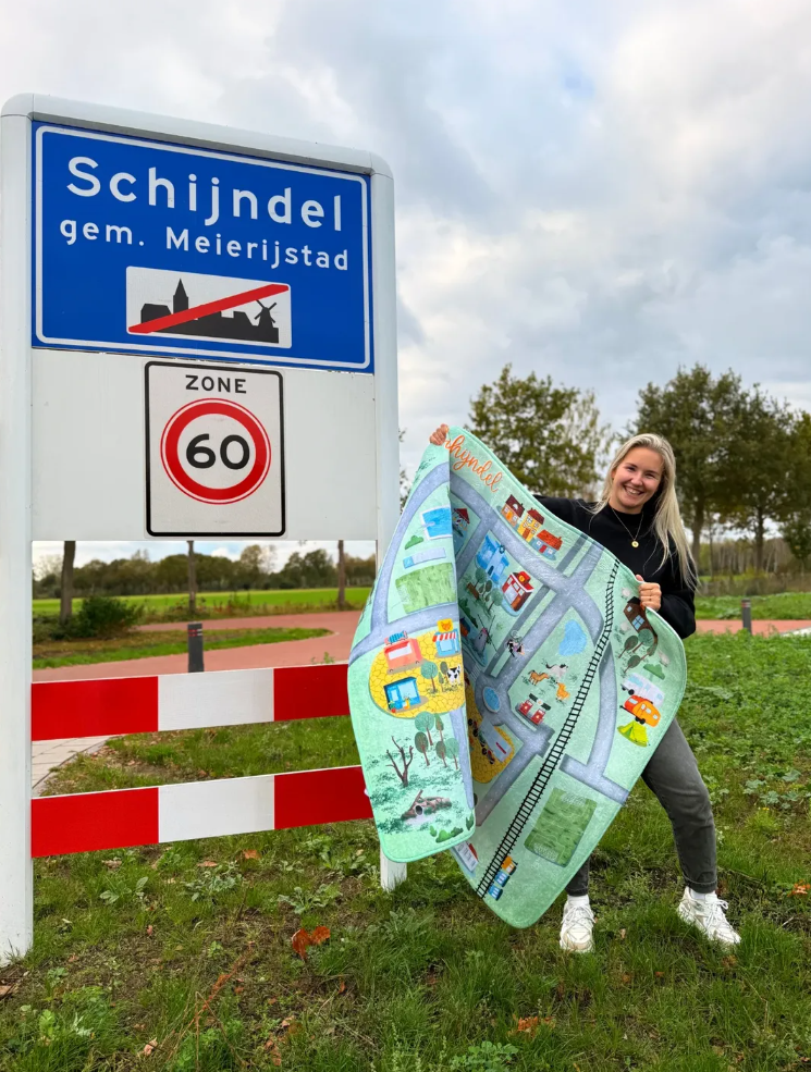 Voor Michelle uit Schijndel maakten we iets bijzonders – een speelmat op maat, volledig geïnspireerd door haar eigen dorp. Op haar vraag brachten we herkenbare plekken, straten en details uit Schijndel tot leven in een speelse, kindvriendelijke vorm.