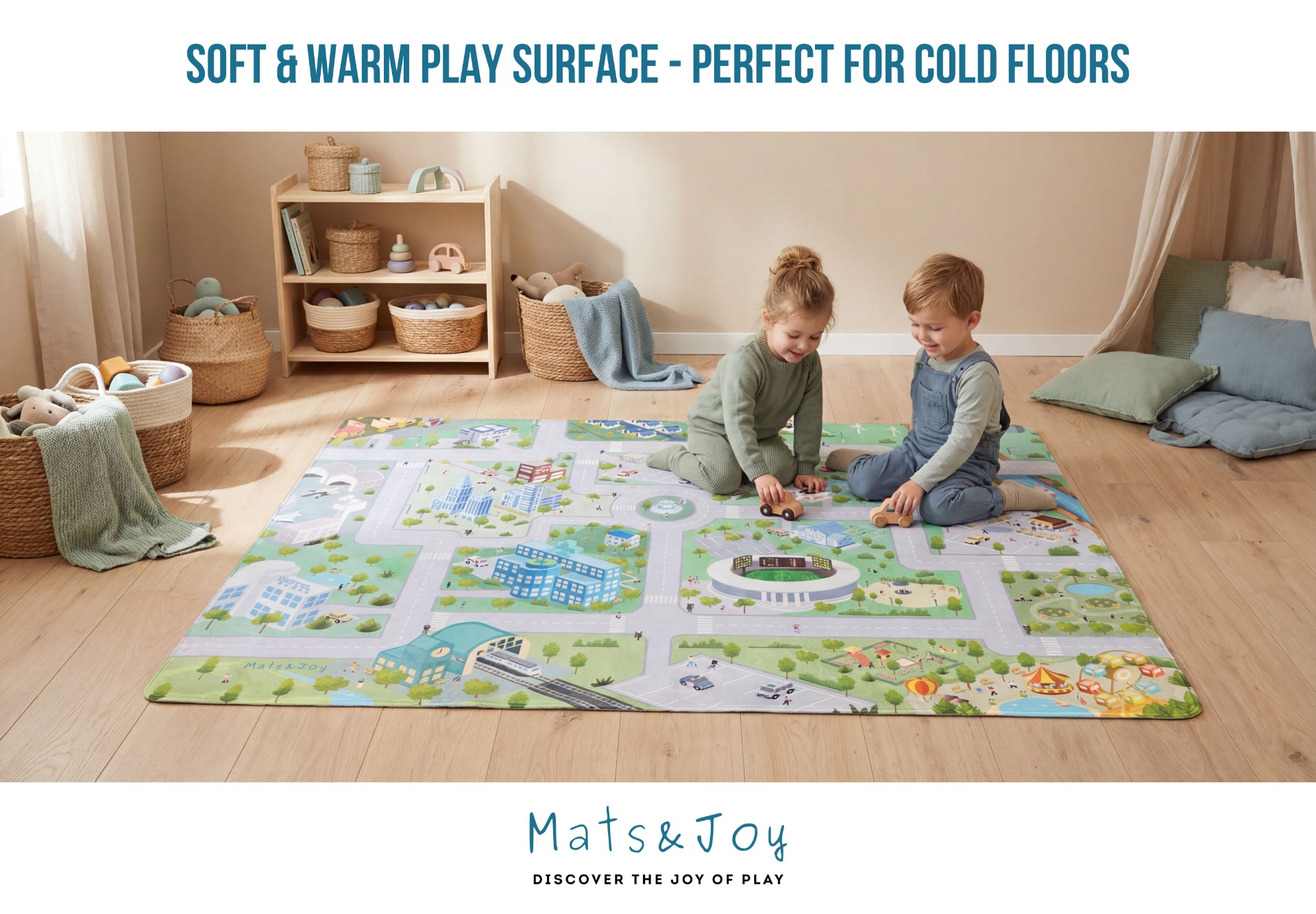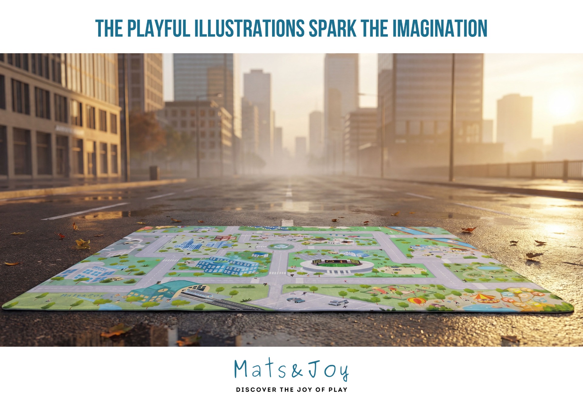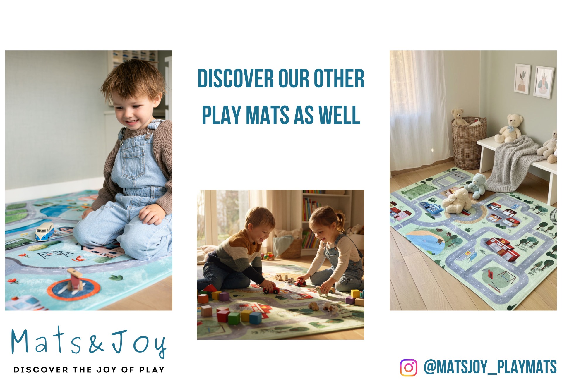 Stap binnen in een wereld vol verbeelding met de Mats & Joy Auto Speelmat – Town Square! Dit extra grote auto speeltapijt (130x180 cm) is dé droomplek voor kleine ontdekkingsreizigers. Van drukke straten tot rustige parken – jouw kind beleeft de leukste avonturen vanuit zijn eigen wereldje.