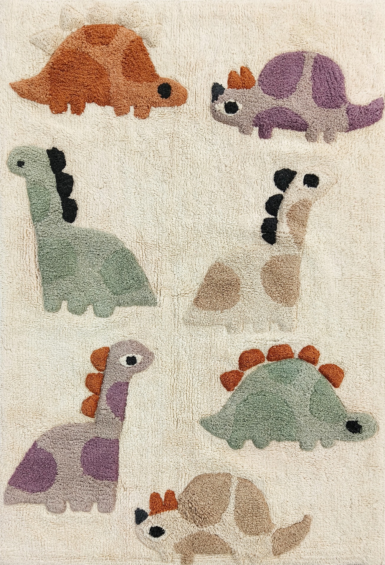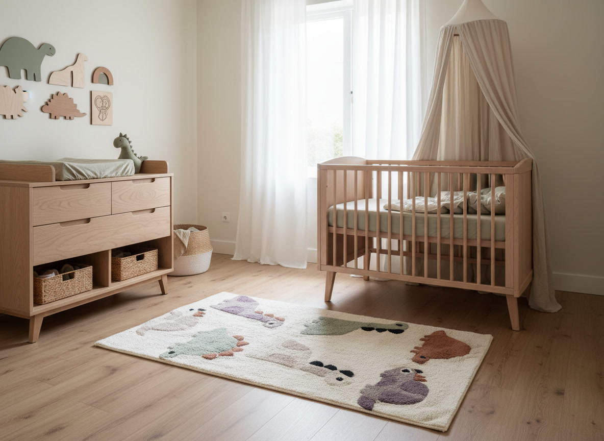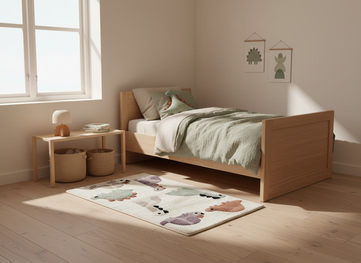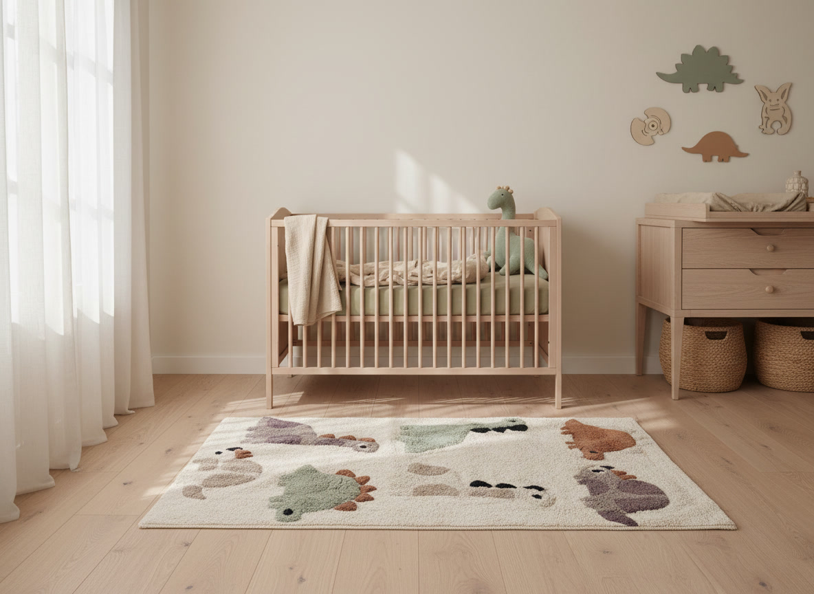 Breng rust en speelsheid in de kinderkamer met dit katoenen dino vloerkleed. De zachte, handgetufte dinosaurussen in warme, natuurlijke tinten nodigen uit tot fantasierijk spel en voelen heerlijk aan onder kleine voetjes. Perfect als decoratief accent naast het bed of in de speelhoek. Een tijdloos, kindvriendelijk tapijt dat warmte en sfeer toevoegt zonder te overheersen.