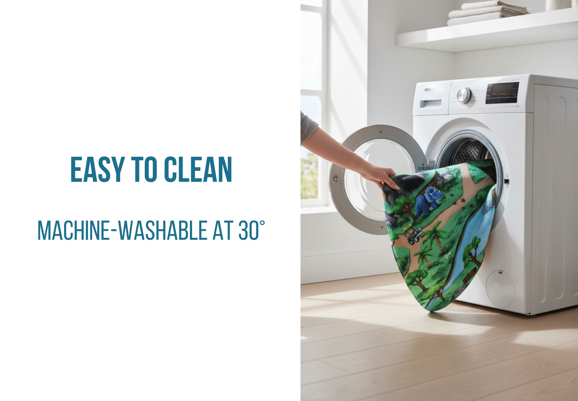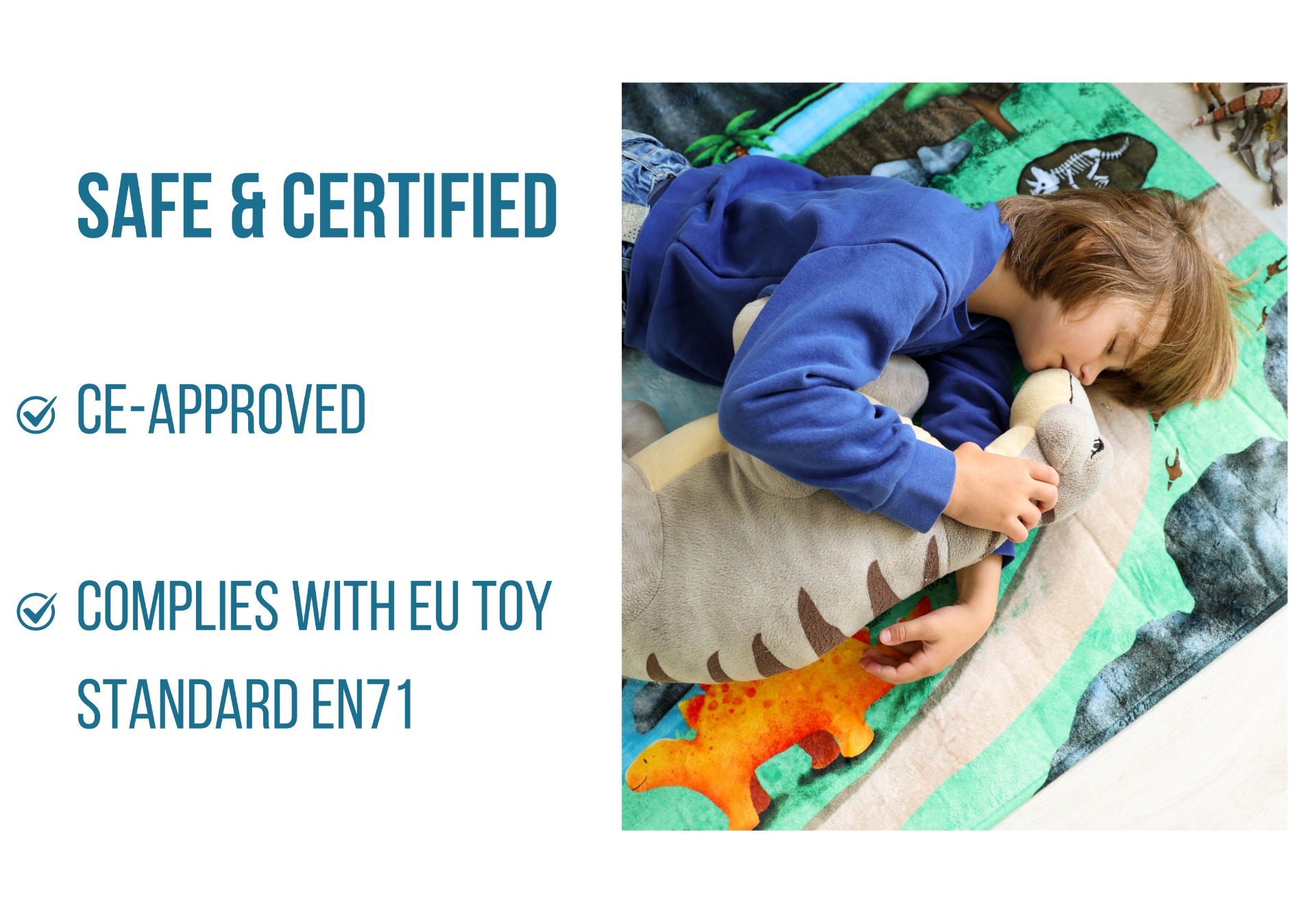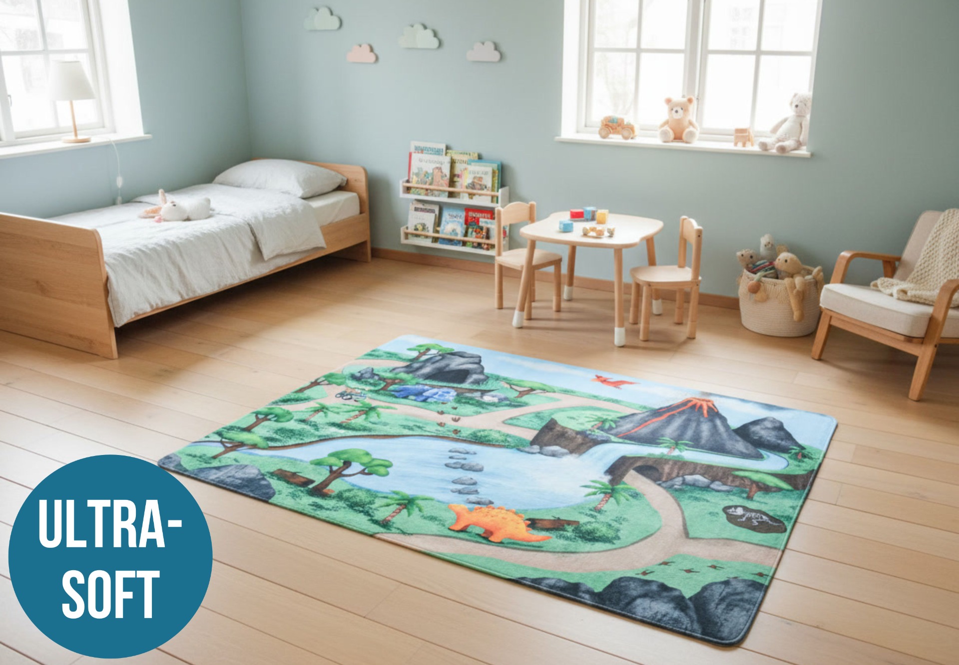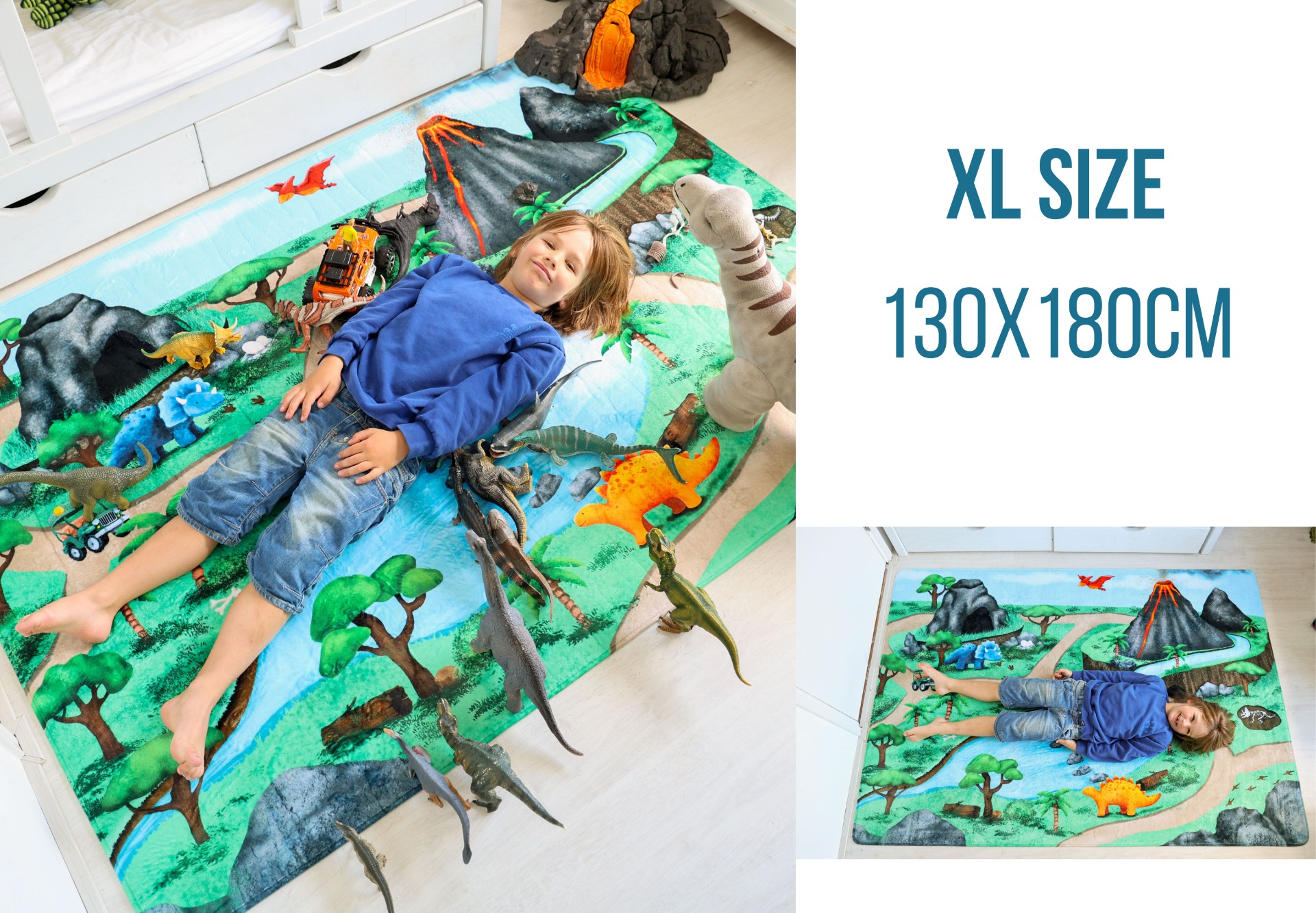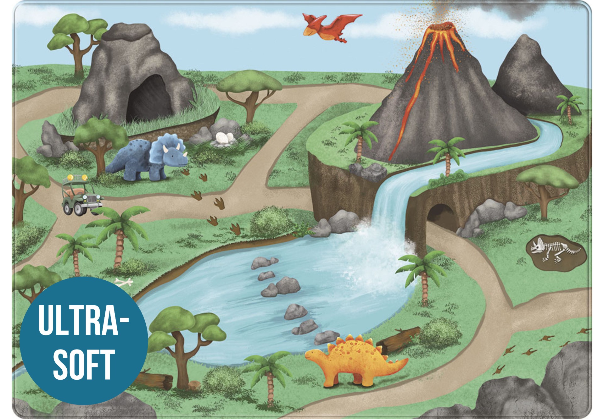 Soft, cushioned, anti-slip and machine washable — this large play mat turns every room into a safe and exciting prehistoric playground.