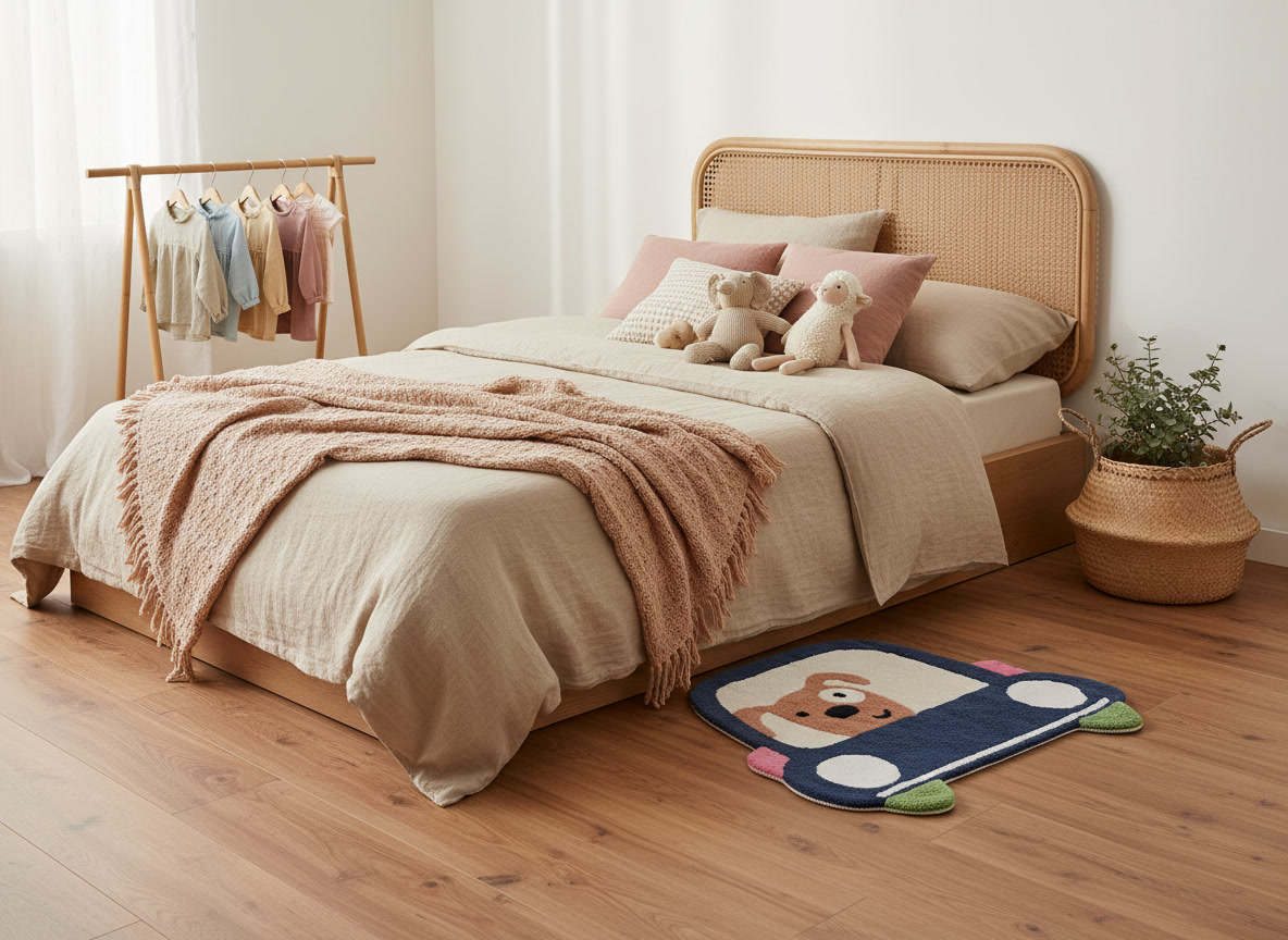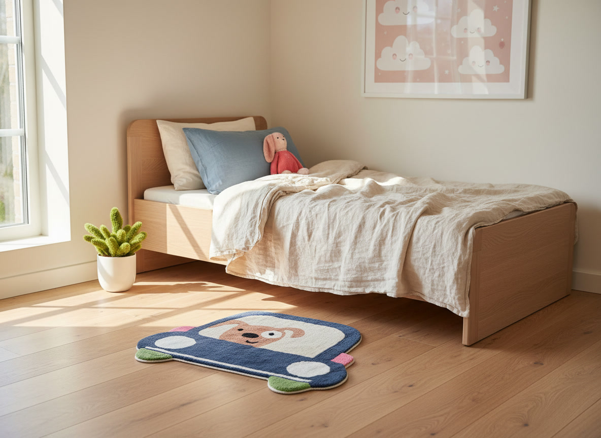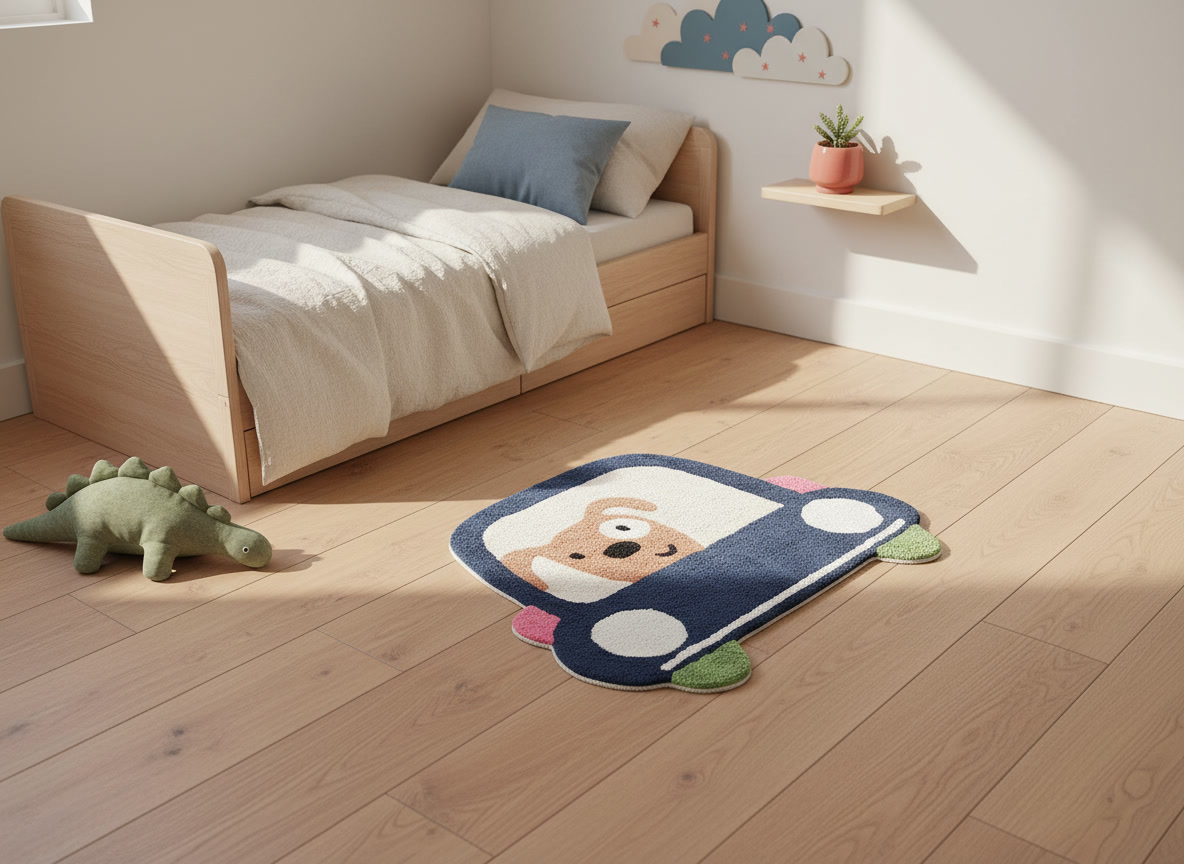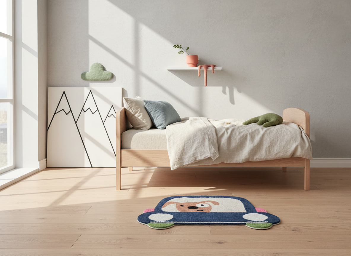 Bring playful charm and softness to the kids' bedroom with this cotton car-shaped rug featuring a cheerful puppy. The soft texture and rounded shape make it perfect for little feet and imaginative play. Ideal as a decorative accent next to the bed or in a play corner. A warm, child-friendly rug that instantly adds atmosphere and joy.
