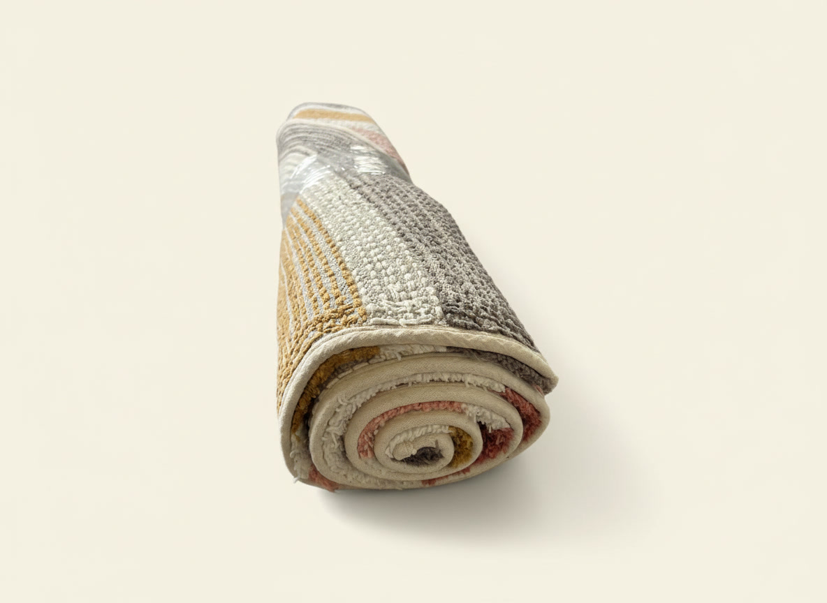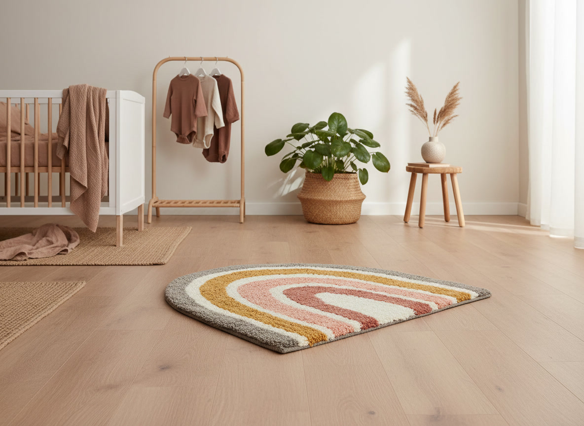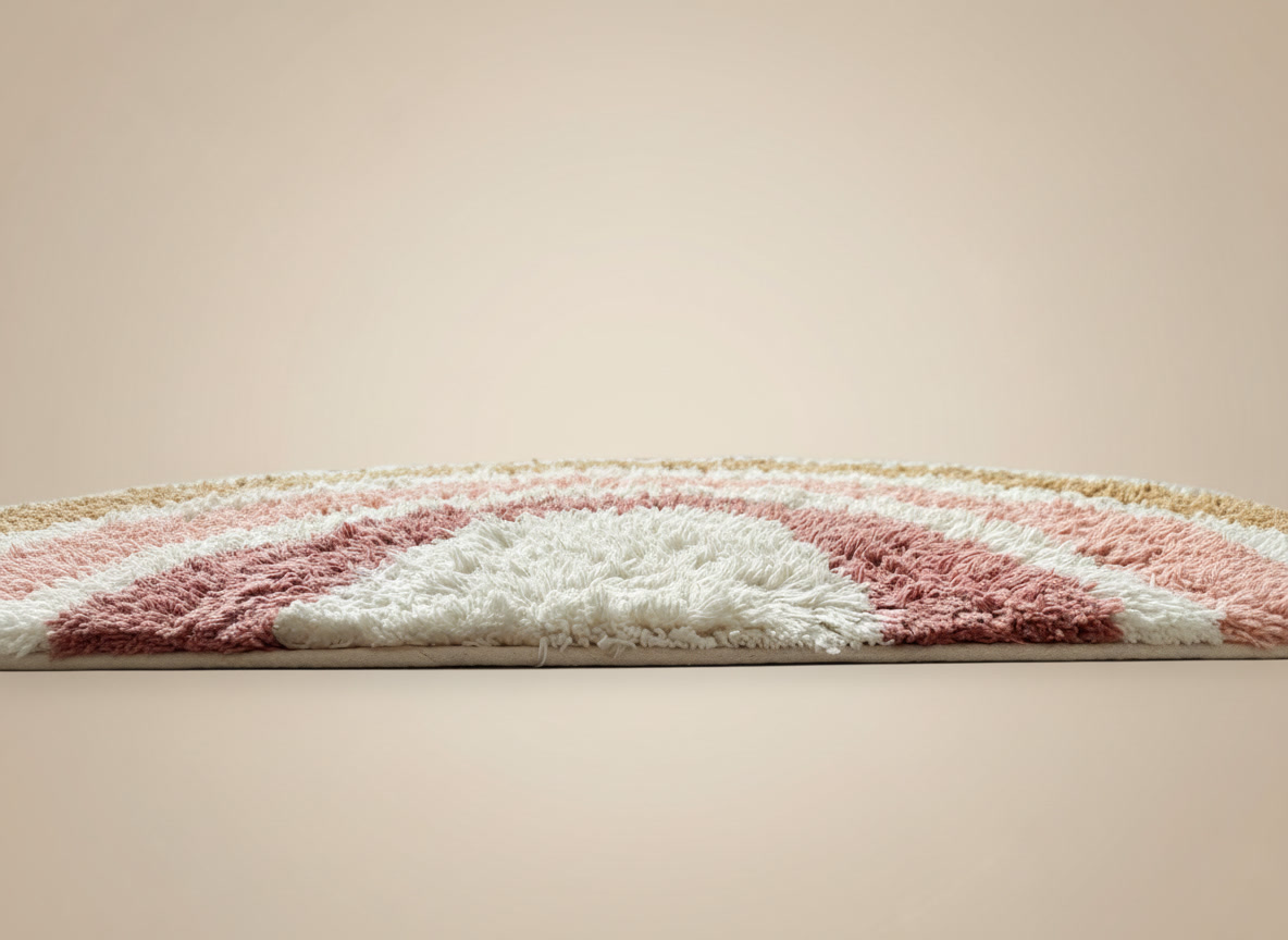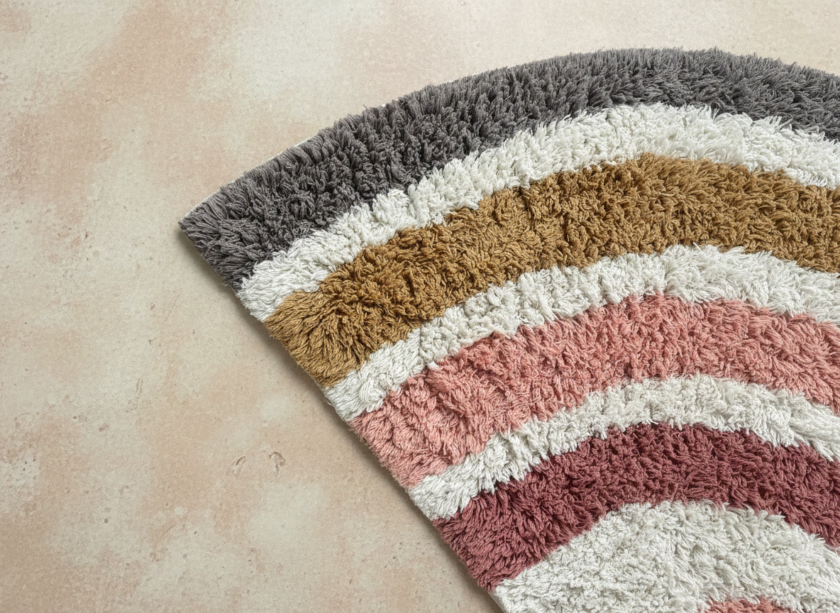 Bring warmth, calm and imagination into the children's room with this Mats & Joy rainbow rug (70 × 100 cm). The soft, rounded rainbow shape and natural tones create a soothing look, perfect for a play corner, next to the bed or by the changing table. The rug feels pleasantly soft and adds extra comfort. A stylish and child-friendly accent that fits effortlessly into any modern nursery or children's bedroom.