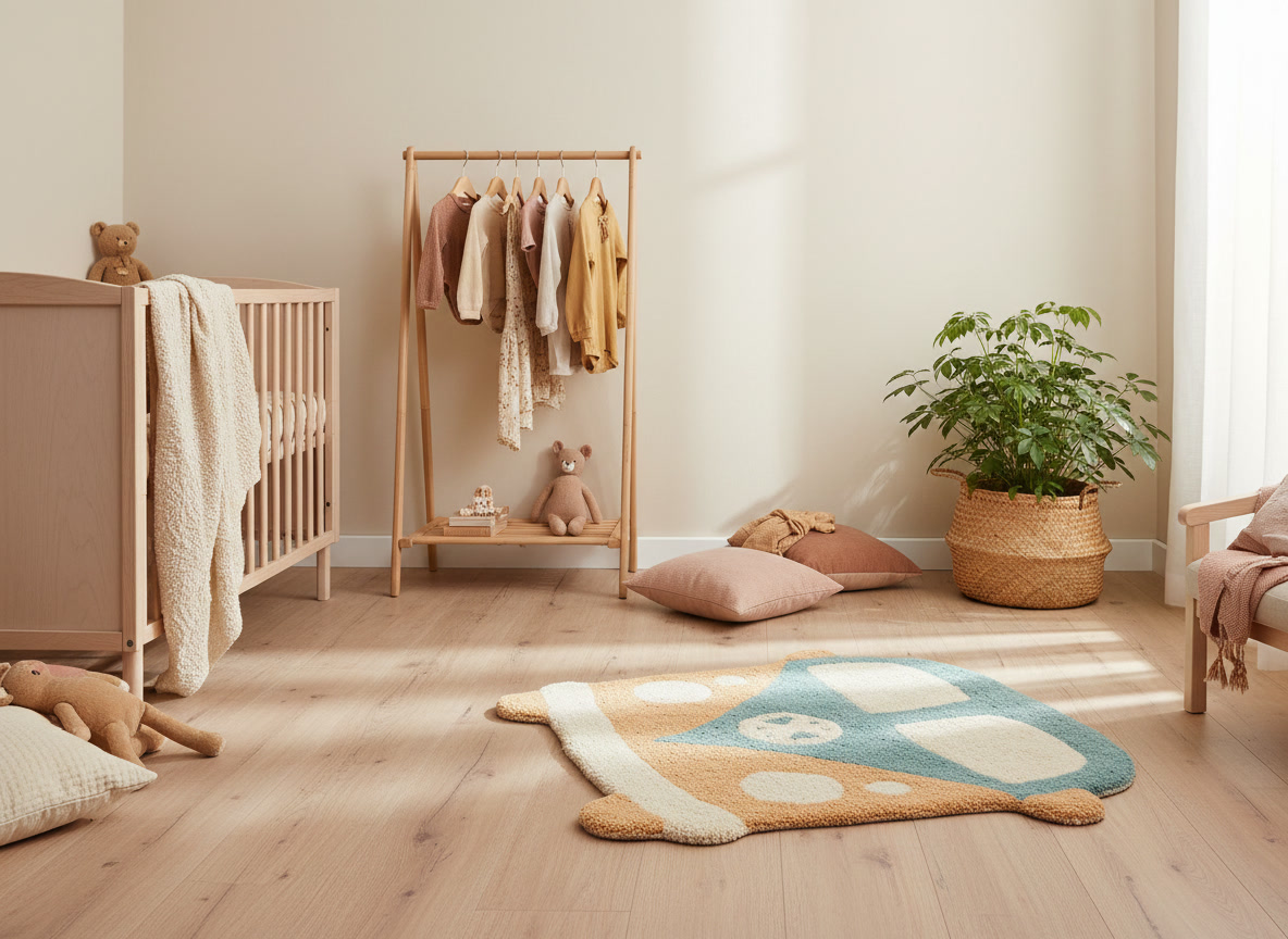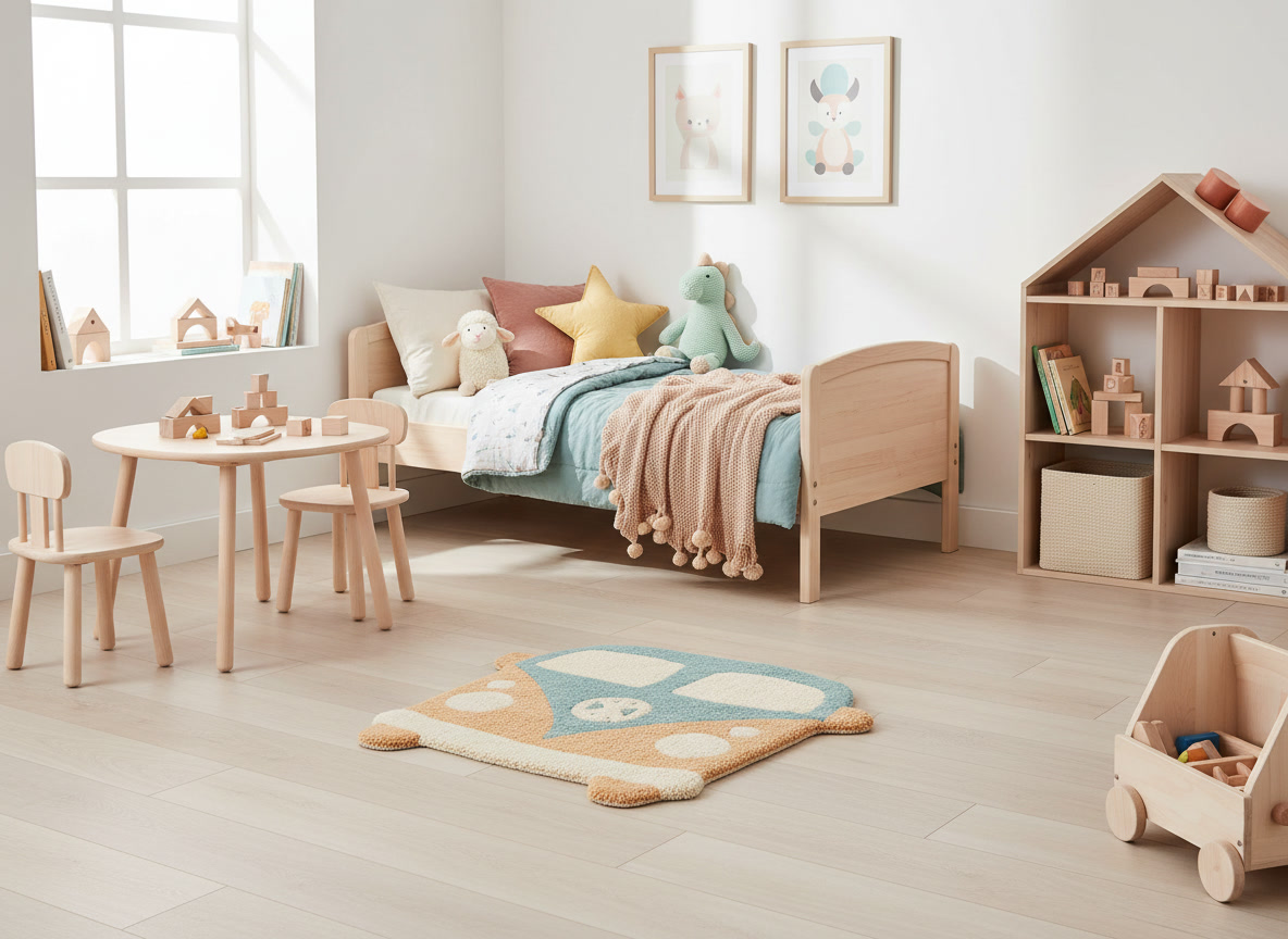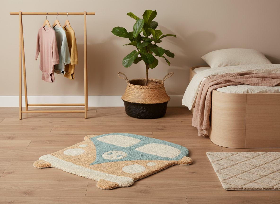 Bring warmth and character to the kids' room with this Retro Camper kids rug. Its playful camper shape and soft, vintage-inspired colours make it a charming decorative accent. Perfect beside the bed or in a play corner, this compact rug adds instant coziness while feeling soft and comfortable under little feet.