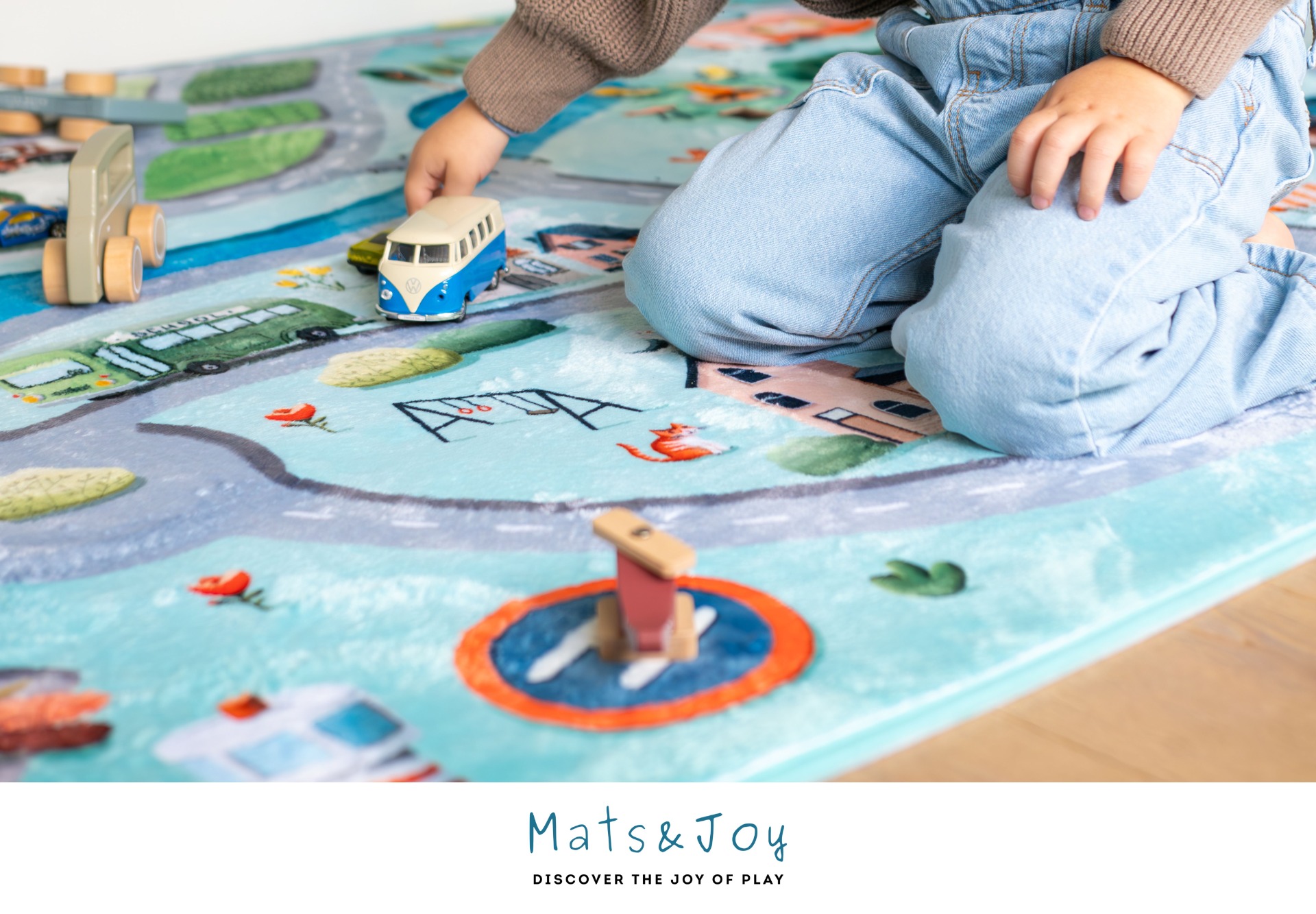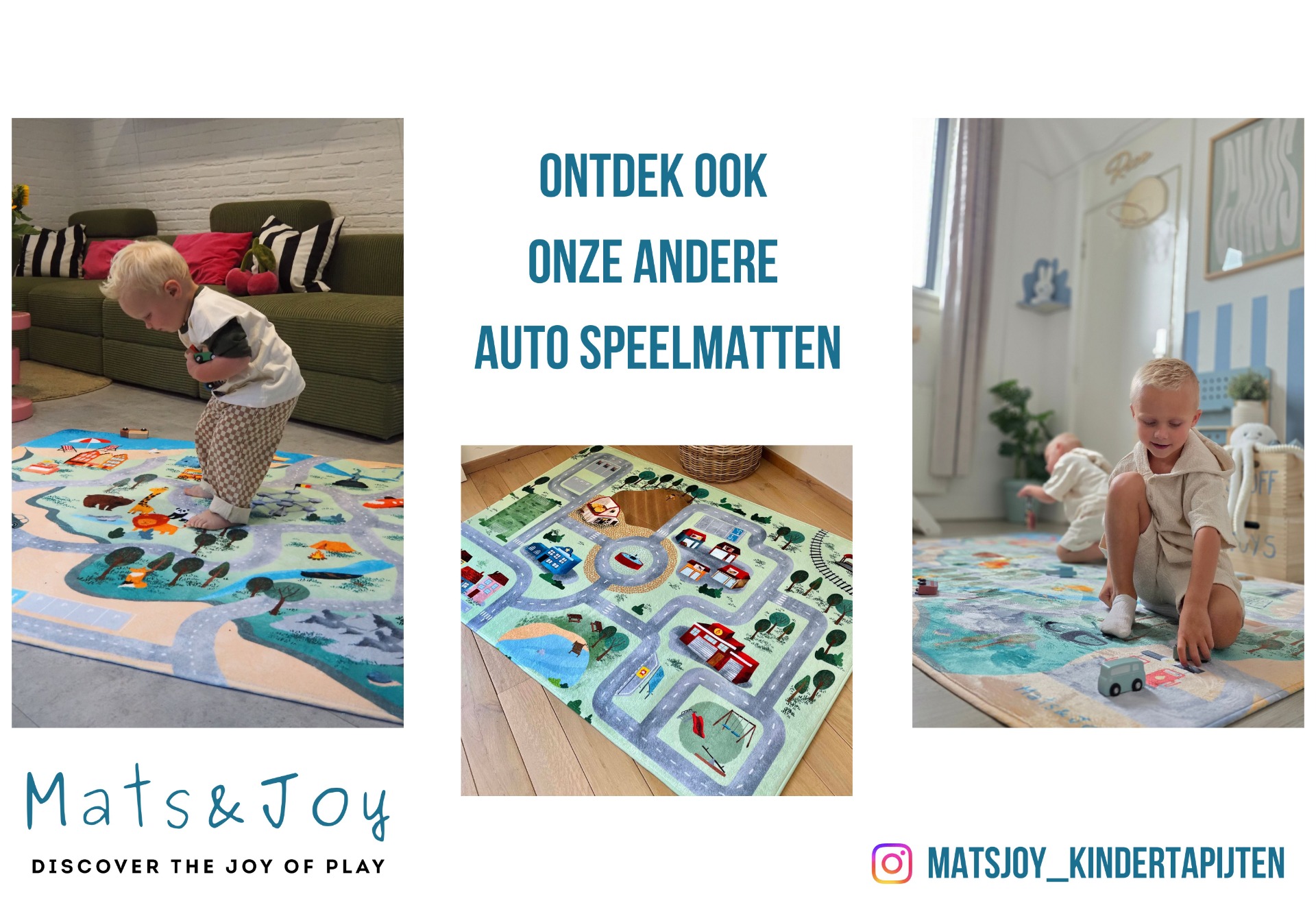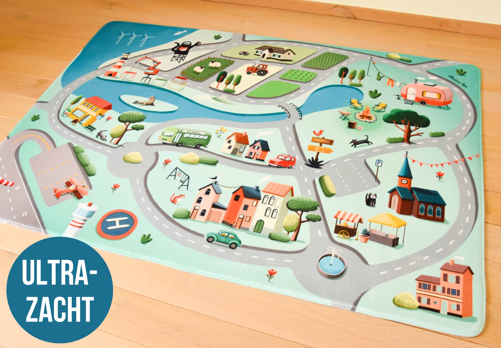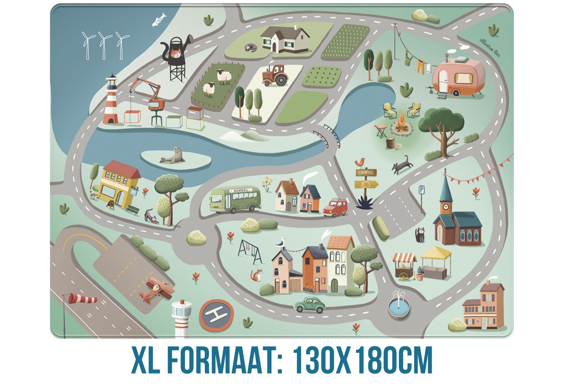 Roadtrip Autobaan Speelmat – Eindeloze avonturen wachten! Reis langs de kust, ontdek een boerderij, een gezellige camping, een luchthaven en meer! Zacht, stijlvol en perfect voor uren speelplezier. Maak je klaar voor de rit!